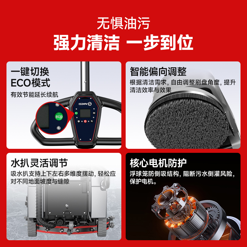 機身寬度僅450mm,可在商超餐廳等場景內使用,貼墻清潔輕松使用清潔無死角;176半包圍靈動吸水扒秒干不留痕,轉彎不漏水;多維立體出水方式,分布均勻,洗地省水省清潔劑